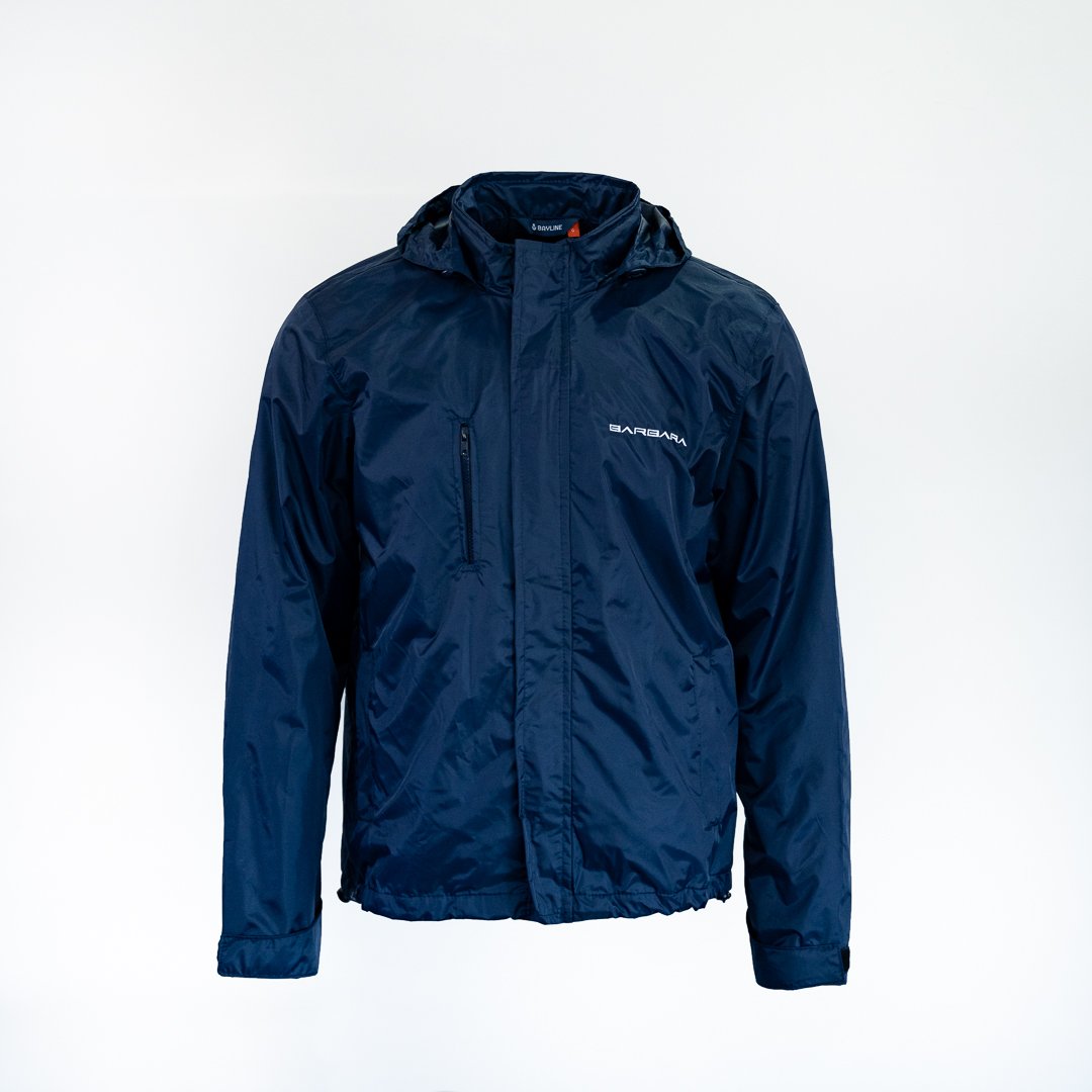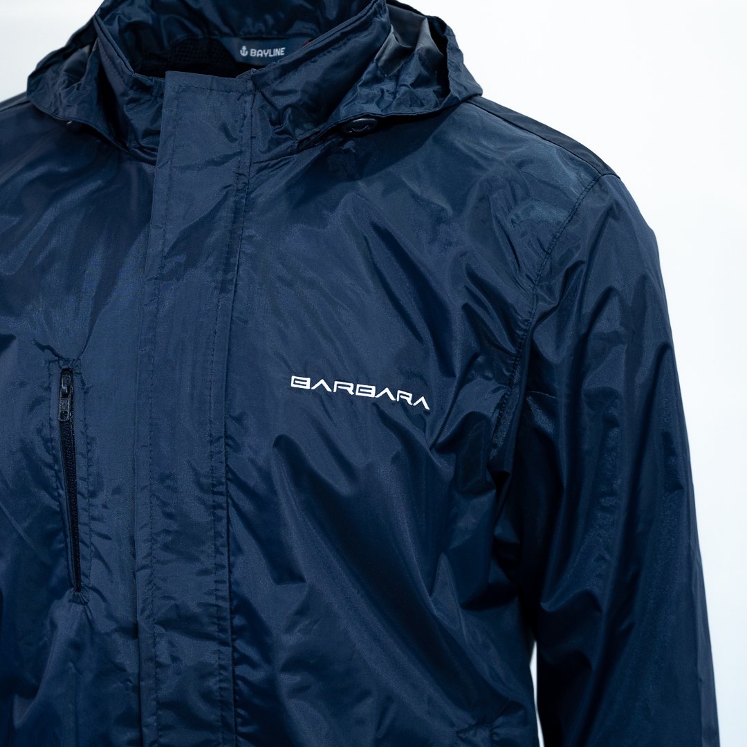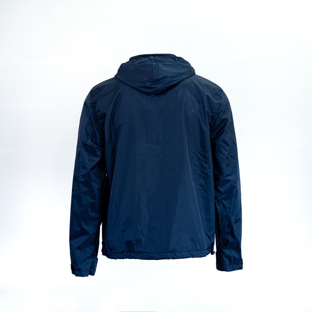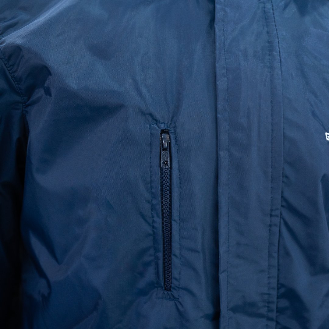 A jaqueta externa tem dois bolsos sem zíper nas laterais e um bolso com zíper no lado direito do peito. Tem ajuste de velcro nos punhos e de elástico na barra. Capuz que pode ser dobrado e guardado dentro da gola.
